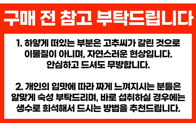 와 놀랐습니다. 보통2+2 상품이면 합쳐서 4kg 상품으로 보내주는데 2k씩 두봉지로 보내주셨어요. 덕분에 김치담을통에 편하게 담았습니다. 국물도 홍고추 갈아넣은건가요? 아주 깔끔합니다. 익기전이라 짭잘하긴한데 익으면 맛있을거같습니다. 잘먹겠습니다