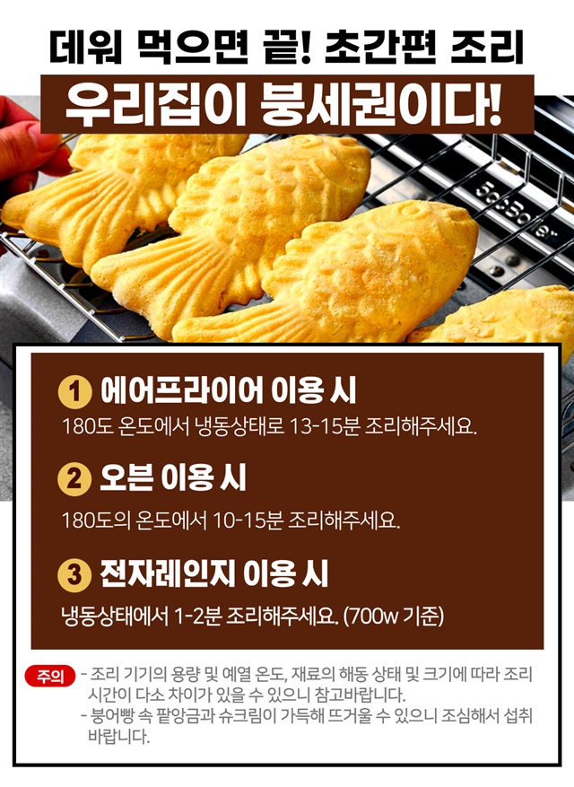 결론부터 말히면 재구매각🥹 다른거 구매하러 왔다가 이 붕어빵이 궁금하더라구요. 정말 옳은 선택이였습니다. 반죽도 얇고 에프에 구워먹으니 바삭하고 맛있어요!! 외관 모습은 좀 붕어아이스크림처럼 생기긴했지만 진짜 팥과 슈가 머리끝부터 발끝까지 꽉 차있어요!!!! 다 먹기 전에 재구매할게요~