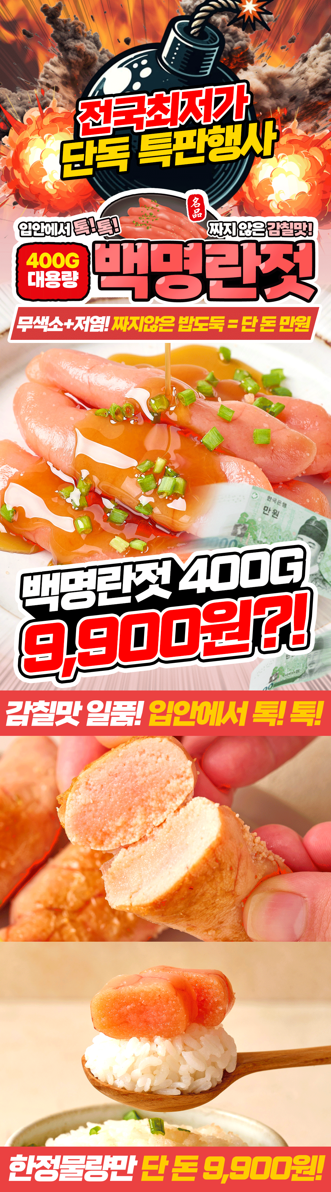 ★한정물량★ 입에서 톡톡! 터지는 무색소 백 명란젓 400G