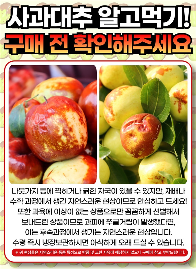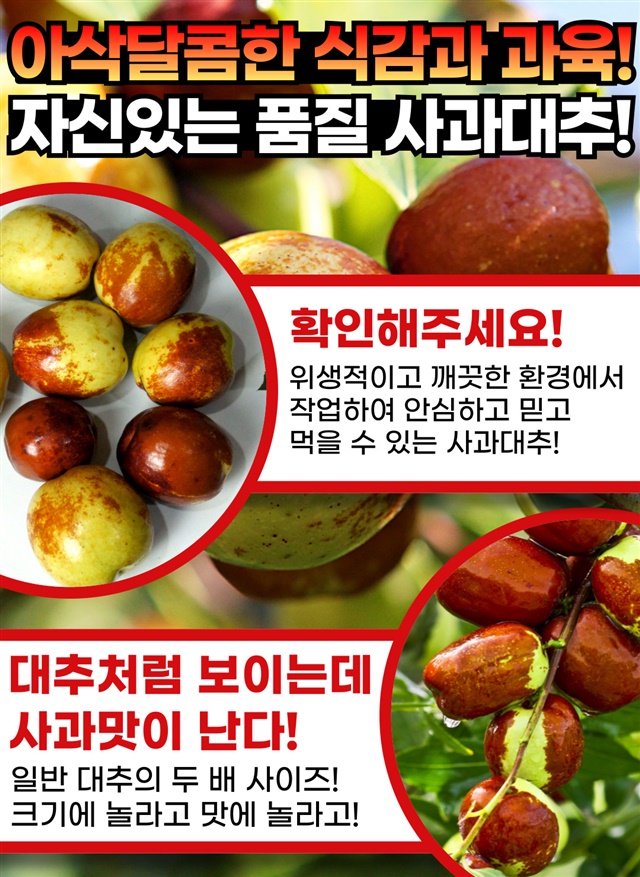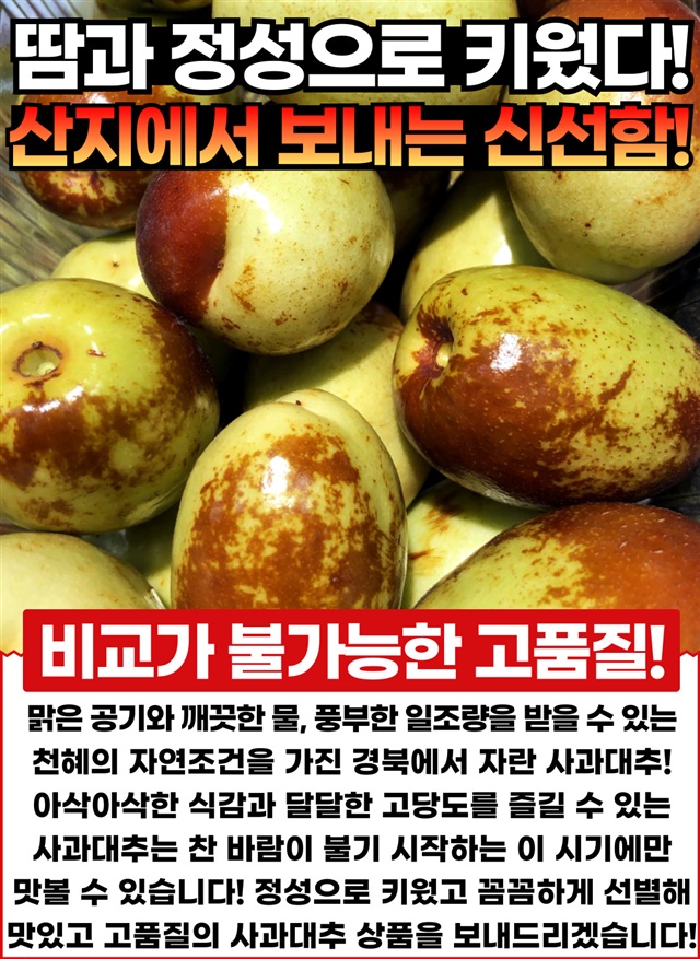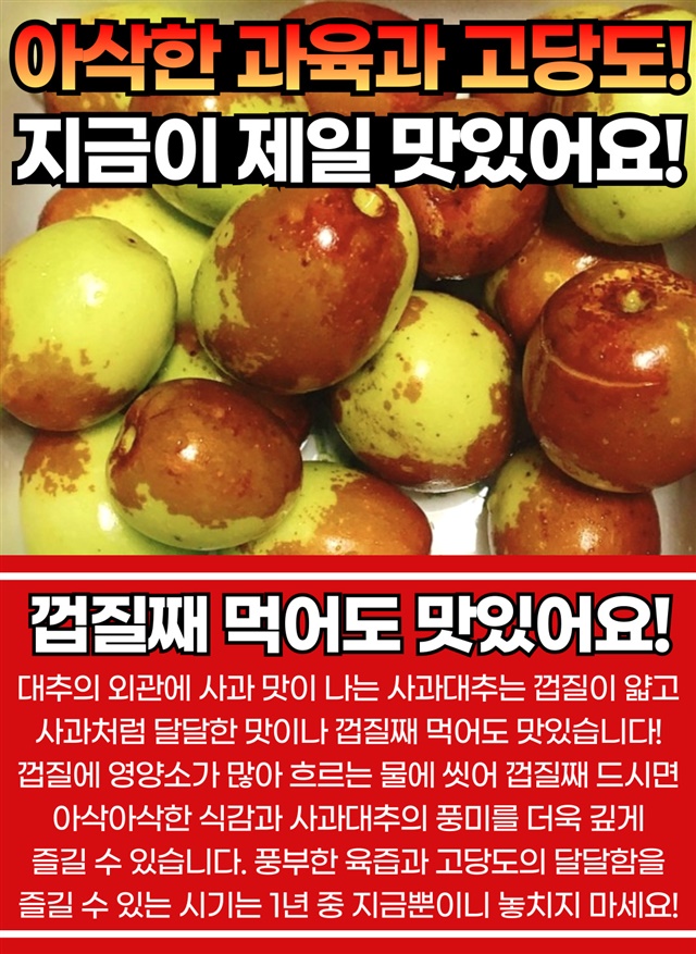시장에서 파는거 백화점에서 파는거 골고루 사먹어 봤는데 그중에서 욜로딜 사과대추가 진짜 모양도 동글동글 탐스럽고 맛도 달고 시원하고 아삭아삭 제일 맛나요. 배송 받자 마자 8알 순삭 먹고 후기 씁니다. 딱 단 2주만이라니 이제 아껴 먹어야겠네요 번창하세요