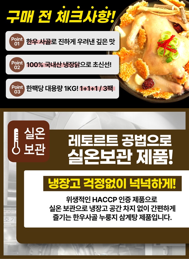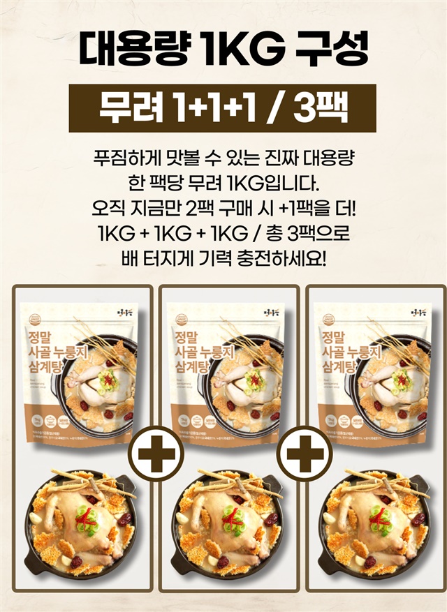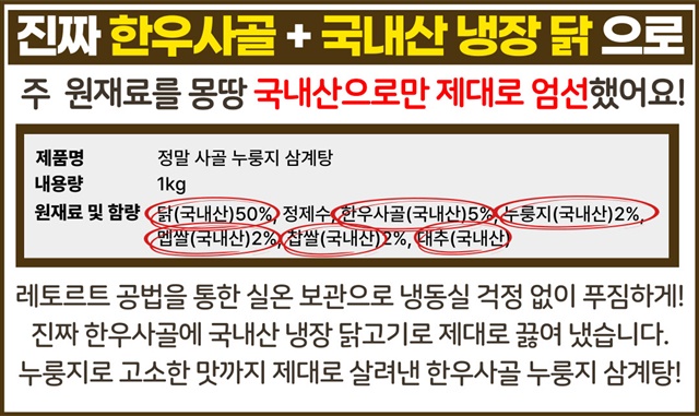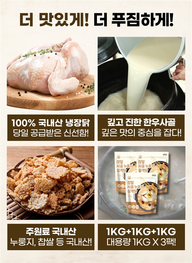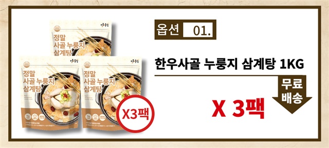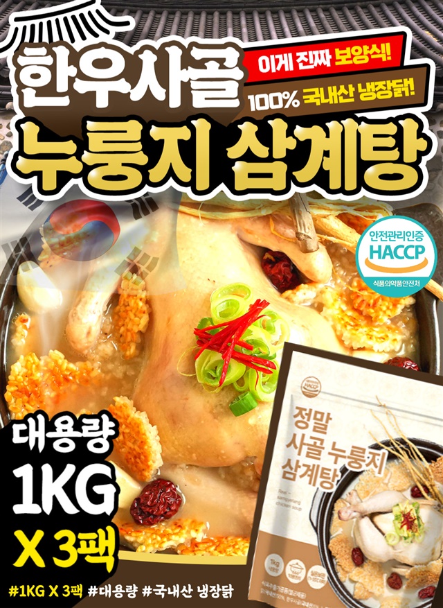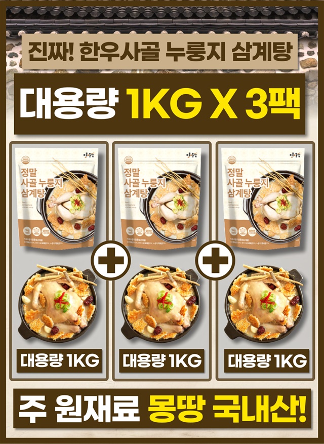 [국내산닭] 한우사골 국내산 누룽지 보양 삼계탕 1kg X 3팩