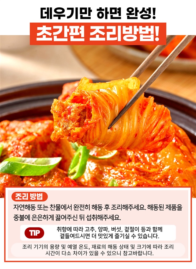 딜이 바뀐 후로 처음 구매했네요~ 매번 한번씩 김치찜 구입해 놓고 급할때 빠른 조리로 잘 먹고 있어요 더운 여름 불 앞에 있는 시간을 줄여줘사 감사해요